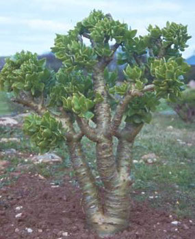 Tylecodon paniculatus can reach heights of 2 m, making it the largest of the tylecodons. It is summer deciduous. The plants conserve energy by photosynthesising through their greenish stems during the hot dry summer months. The yellowish-green, papery bark is a very attractive feature of this plant and has given rise to the common name. During the winter, plants are covered with long, obovate, succulent leaves clustered around the apex of the growing tip.