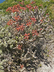 The long, reddish-orange, tubular flowers are borne in upright racemes at the onset of summer in November each year, just as the leaves turn yellow and drop off. In nature the plants tend to grow in groups, making a spectacular show when they flower. The seeds, which are very fine, are released from seed capsules during the autumn (March/April), just in time for the winter rains. In summer rainfall areas, flowering times and subsequent seed maturation may be delayed by a few months. The shrub is reported to have a surprisingly weak and shallow root system for its size.