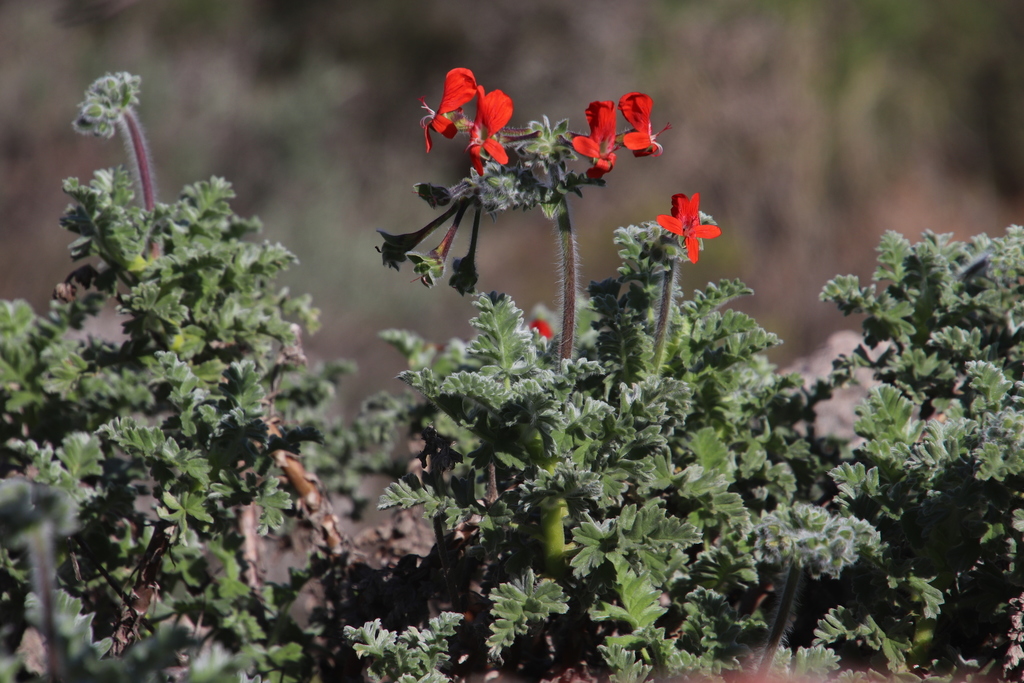 Pelargonium Fulgidum (or rooi malva) is a small, perennial, shrublike plant around 0.4 to 1 meter in height although it grows a few additional meters when supported by branches of other plants growing nearby. Its most striking feature is its bright red flowers with its 5 scarlet or carmine petals. These flowers bloom from June to November (winter to early summer). P. Fulgidum have half-succulent stems which become more woody with age thereby enabling them to withstand harsh conditions. Their leaves are serrated and covered in small, silvery hairs, giving them a silky feeling and assisting the plant in trapping moisture by condensing fog during the nights.